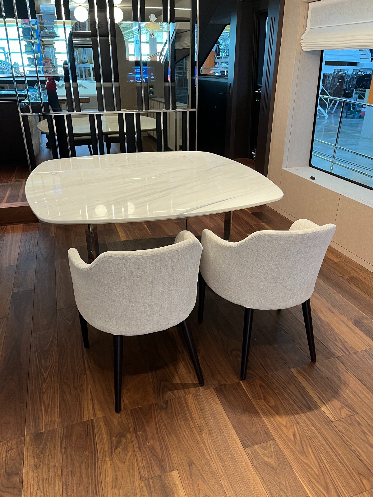 SALA PRANZO CON TAVOLO IN MARMO E SEDIE IN PELLE