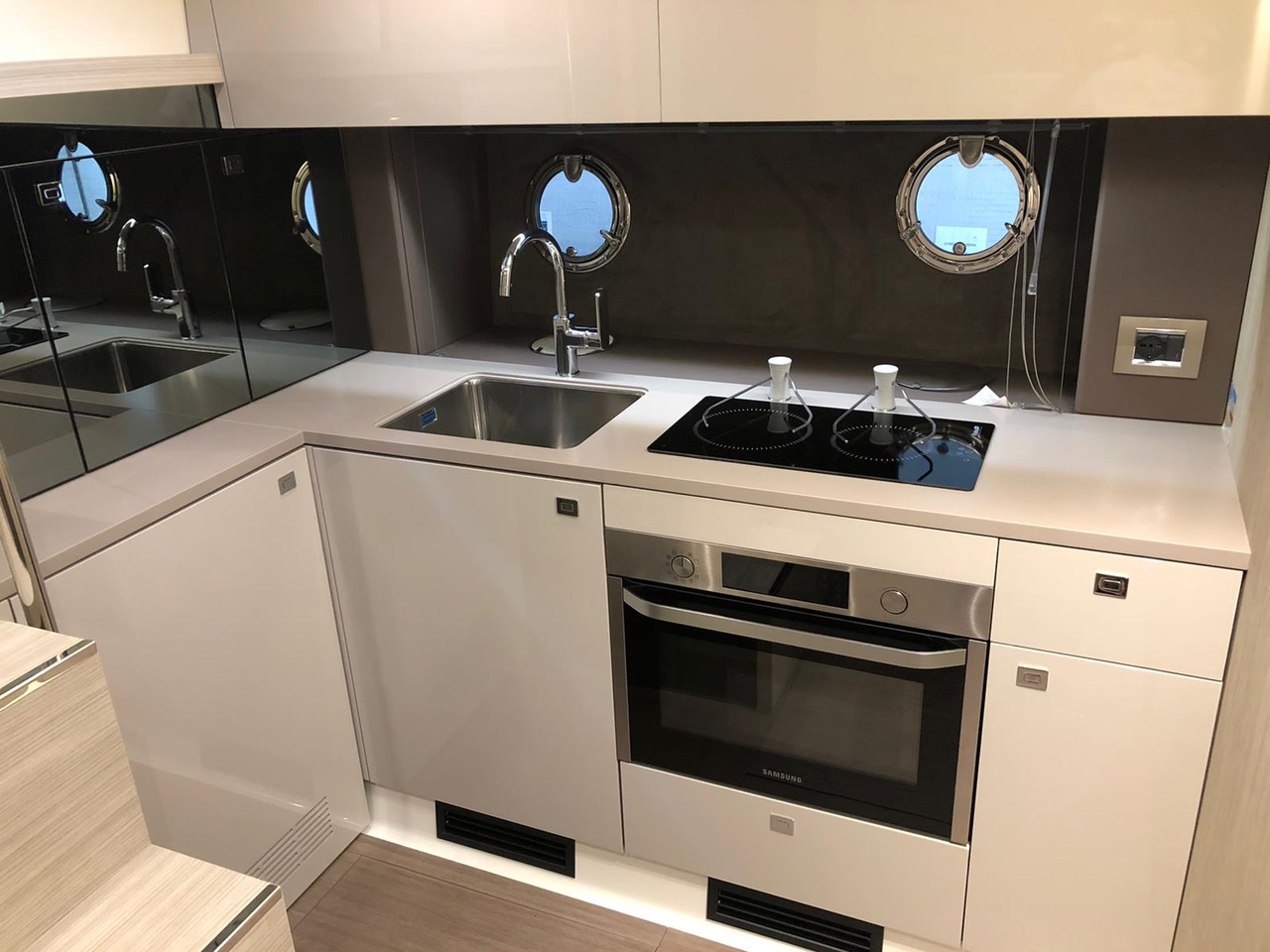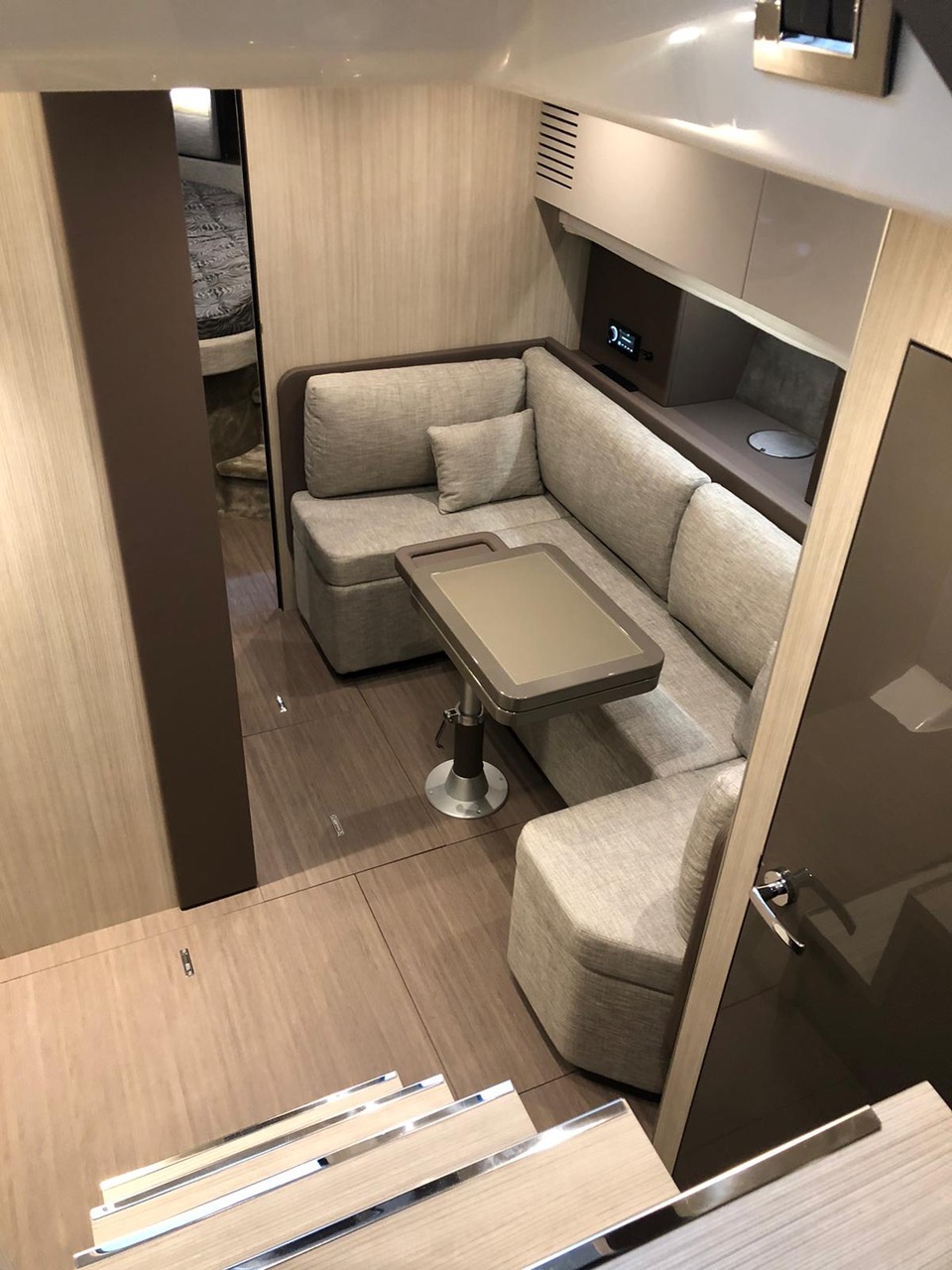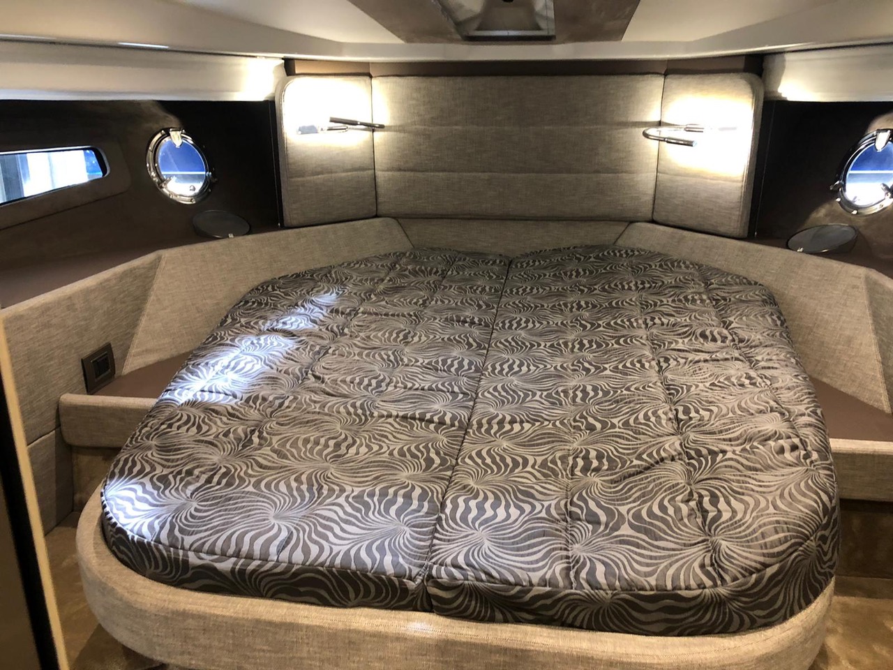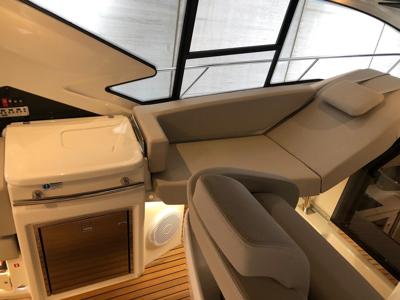 Waste water tank Ultramarine stainless steel anchor kg 21 Antifouling black colour, n.2 coats (no propellers) Air-conditioning system 16.000 BTU cabins,whith heat pump Air-conditioning system 8.000 BTU cockpit cooling, with heat pump Hood for complete stern closing Bow shower Bow thruster with automatic fire extinguisher Cockpit fridge G.P.S. + colour chartplotter 5 KW Generator Additional external courtesy lights N.6 fenders + fender covers Hydraulic gangway m 3, 3 steps Radio system upgrade: n.2 speakers on the foredeck, n.2 on the hardtop, subwoofer in the cockpit with dedicated amplifier Teak laid cockpit Solid teak coverings on lateral stringers 28" Saloon LED TV + DVD + cockpit predisposition + inverter V.H.F./DSC Copy of “CE” certificate and declaration of conformity Hood: alternative colour to standard one INTERIORS IN WOOD Breeze oak 10.69 Cabins' floor in oak staves Soft-Top canvas: alternative colour to standard one Soft Top lacquered (paint no gelcoat) (**)