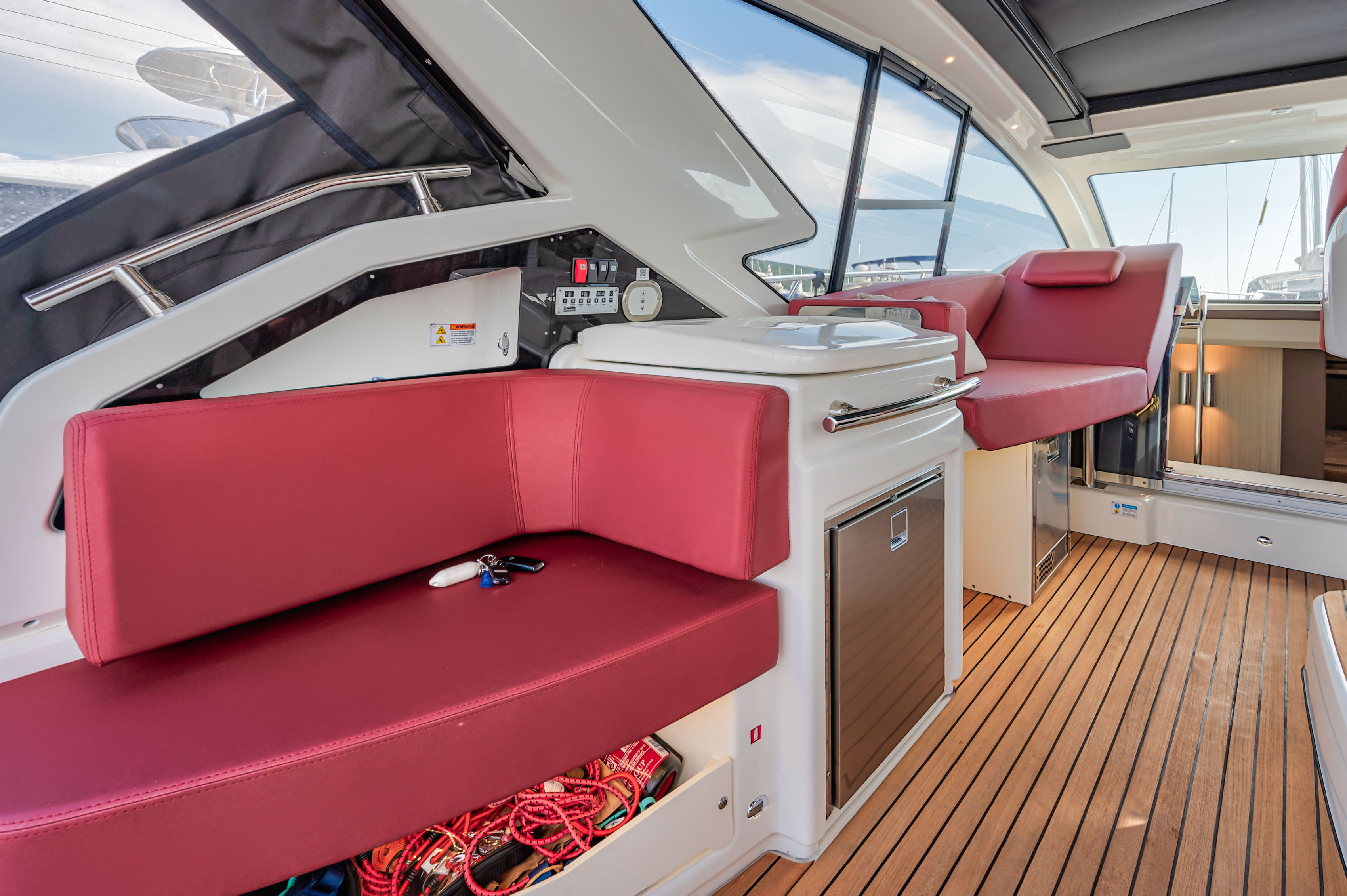 Anchor (21kg stainless steel), Automatic Bilge Pump, 3 Batteries, Battery charger (35ah), Bilge Alarm (Acoustic and visual on dashboard), Bow Thruster (Sidepower), cockpit table, Courtesy Lights, 2 Deck Shower (bow and stern), Directional Spotlight, Draining System, Electric Bilge Pump, Electric Flaps, Electric Windlass, Engine Alarm, Entry door, 4 Fire Extinguishing System, Flaps Indicators, Gangway (Besenzoni 3m), Horn, Living Room Foldable Table, Manual Bilge Pump, Platform (Hydraulic HI LO platform), Shorepower connector, swimming ladder, Teak Cockpit, Tender Garage, 3 Underwater lights, Water pressure pump