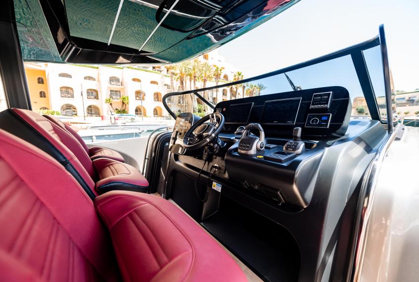 Moving forward, the helm station includes three ergonomic seats, with the captain’s seat positioned centrally for optimal control. The state-of-the-art helm console is equipped with advanced navigation and home automation systems, enhancing the boating experience. The wraparound windscreen and T-Top offer protection from the elements while maintaining a luxurious open-air atmosphere. The bow features a second sundeck offering additional seating and lounging options.