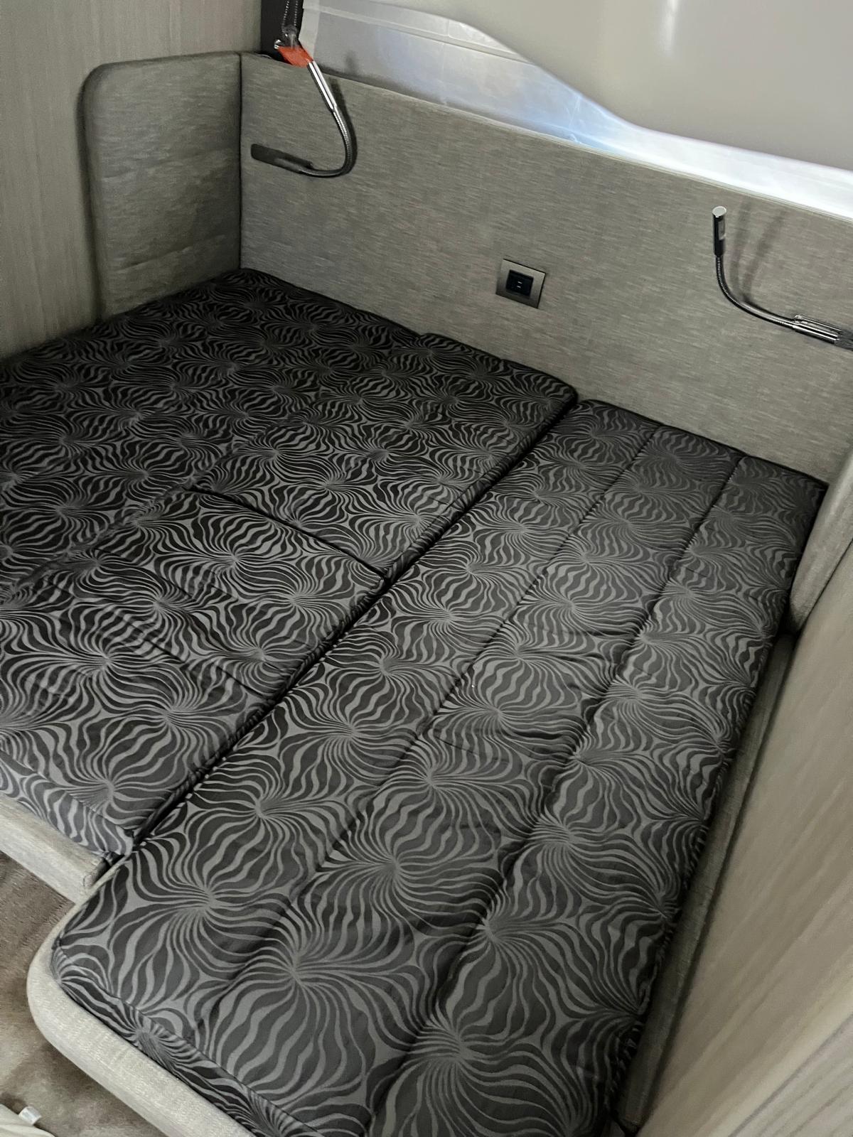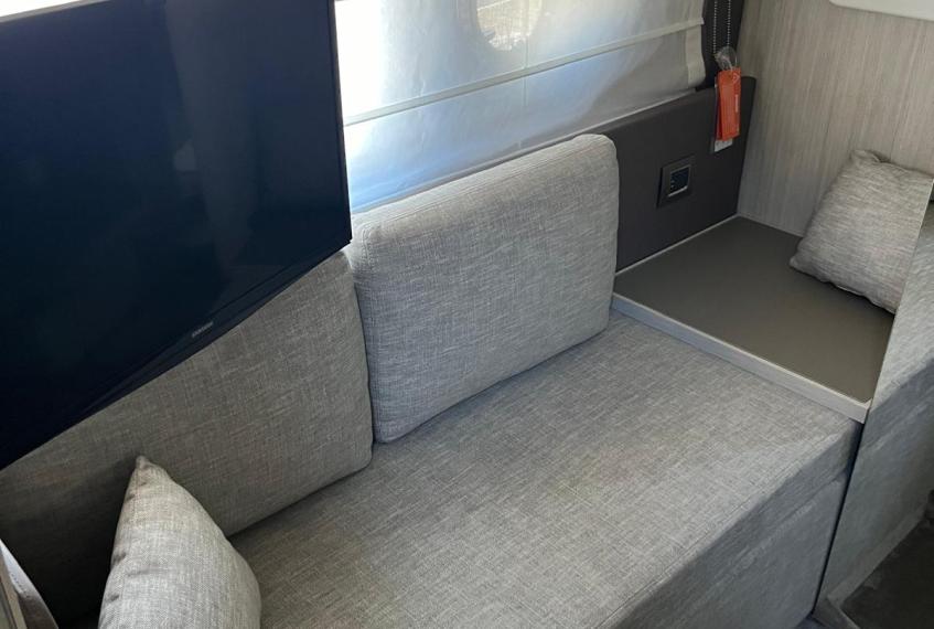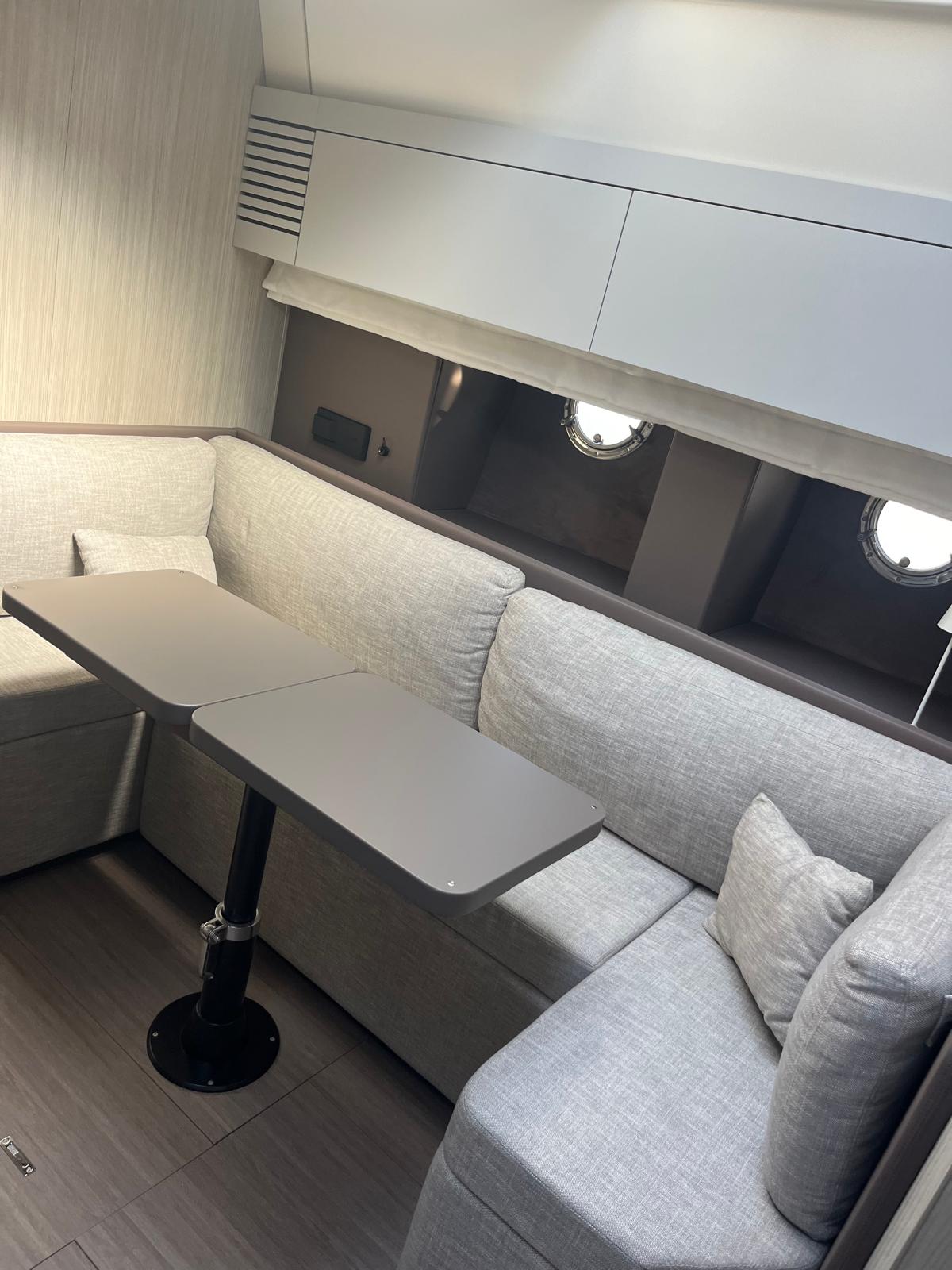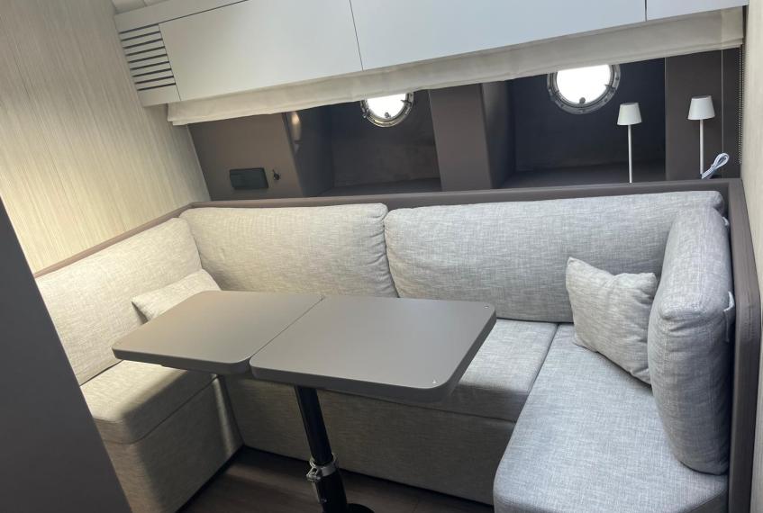 Cabina armatoriale a prua con bagno privato, cabina ospiti a poppa con 3 posti letto, bagno ospiti, dinette trasformabile, grande cucina.