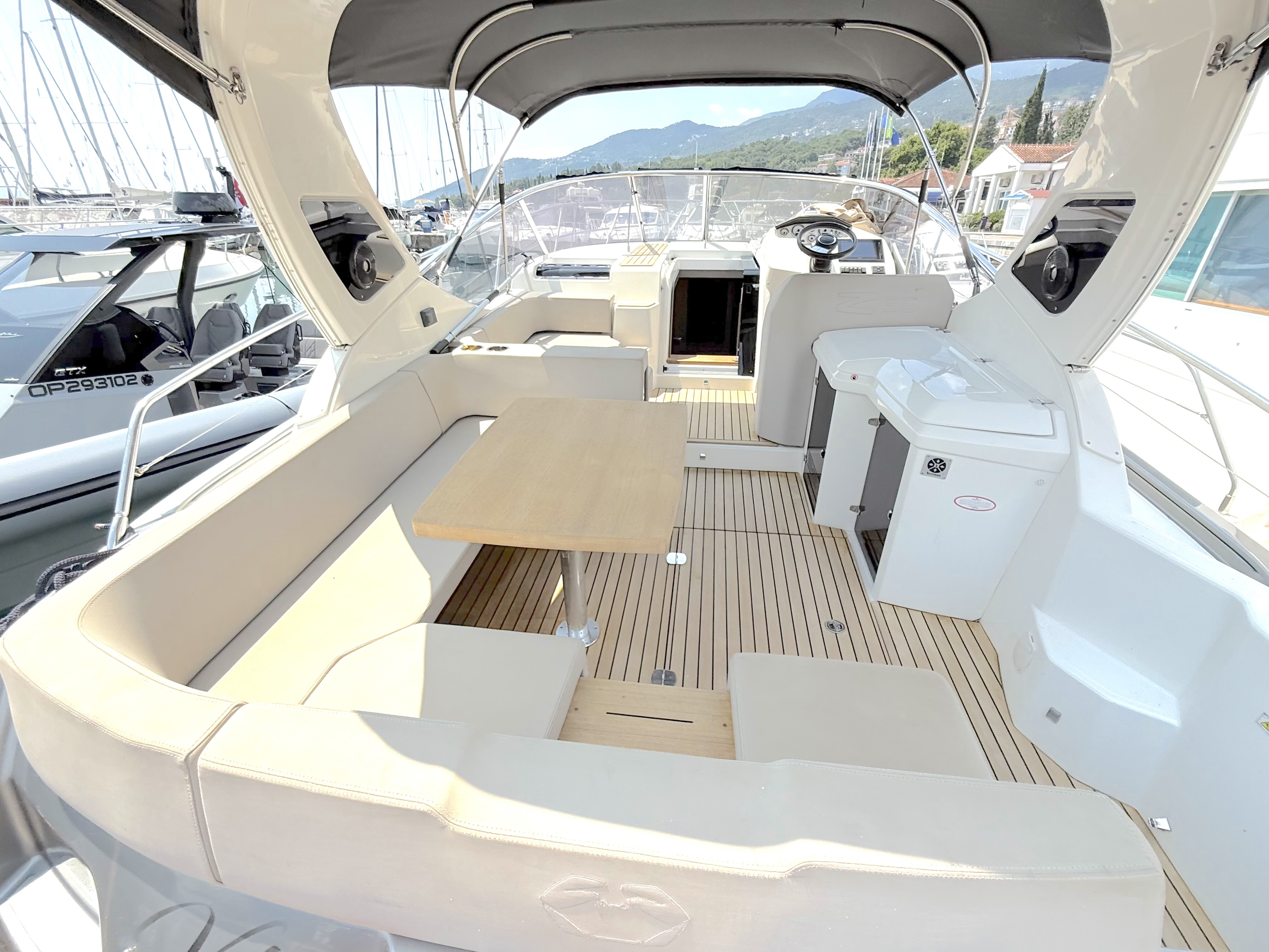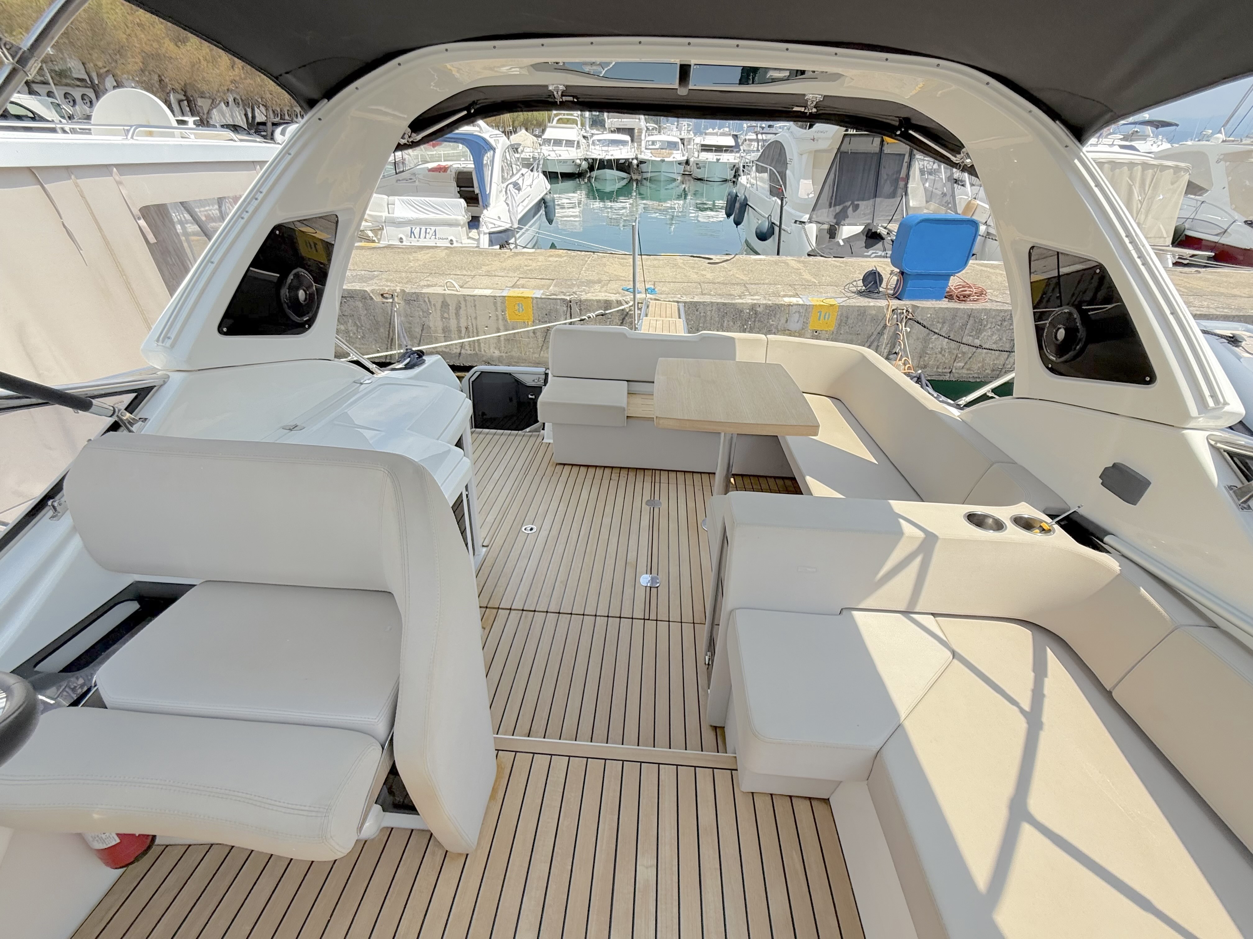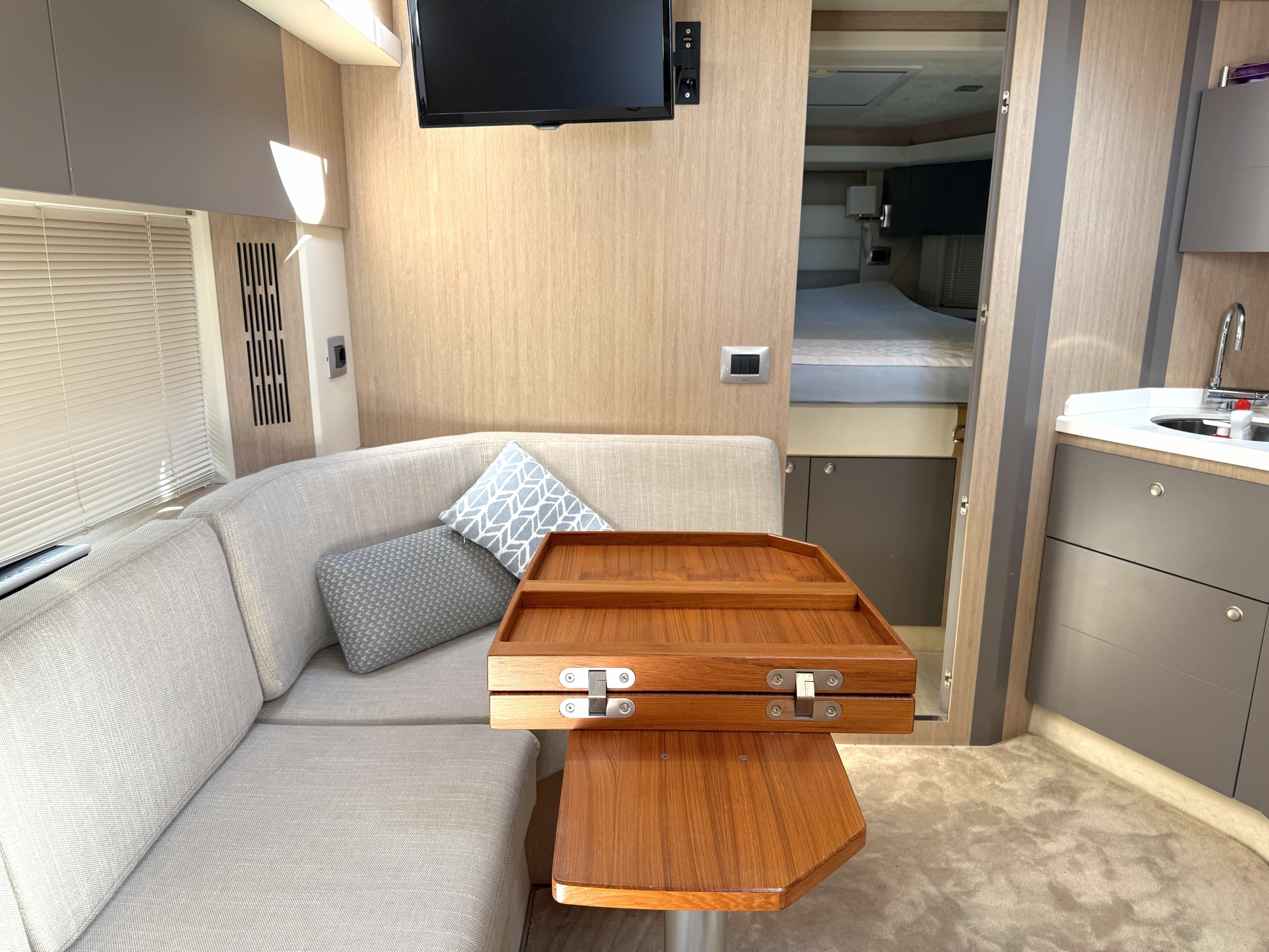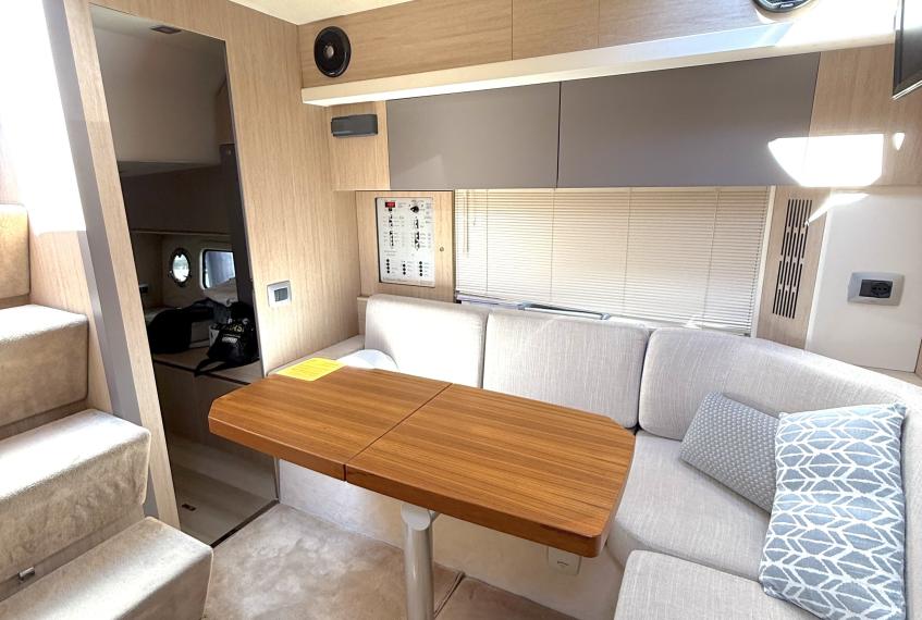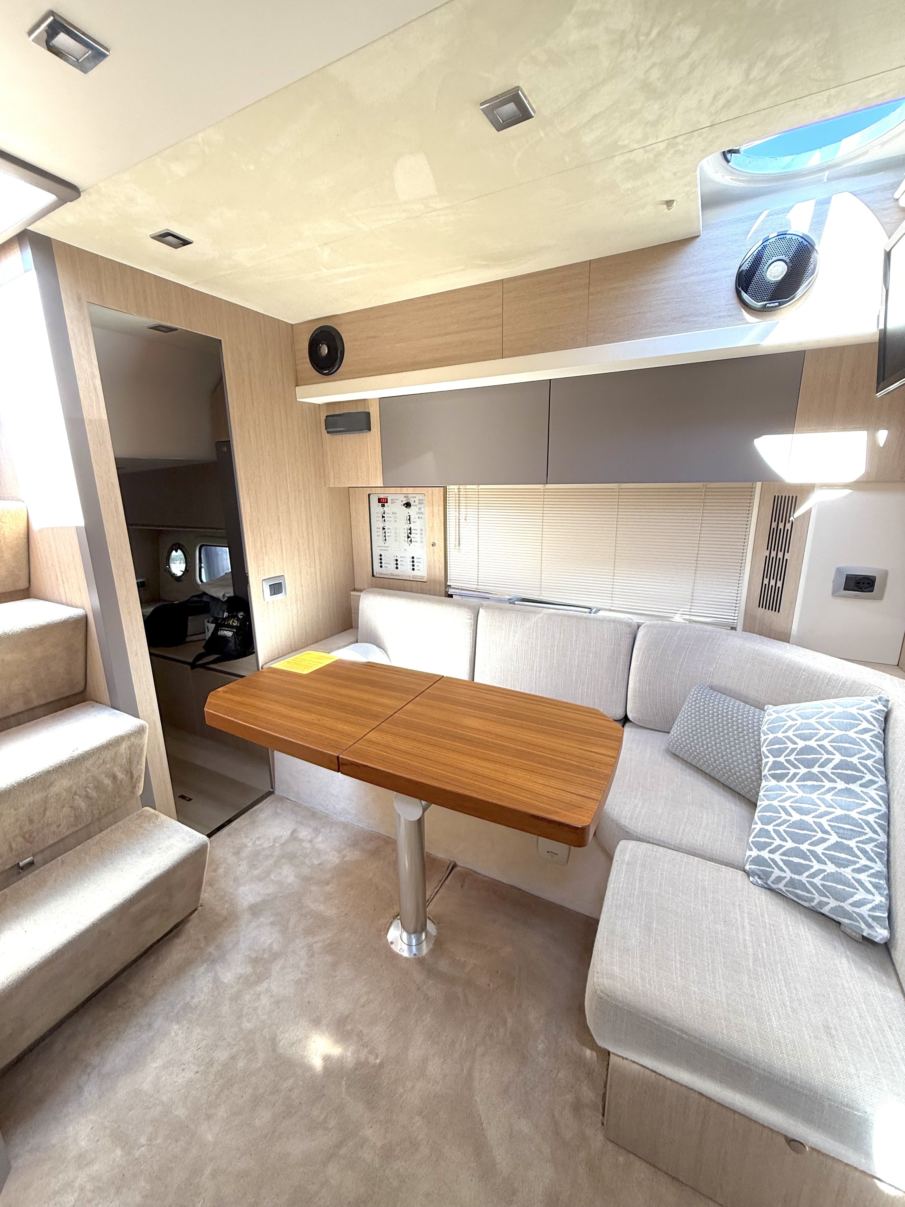 OPTIONALS: 2 X Volvo Penta D4 2x260 hp - 630 HOURS EUR 224.000,00 VAT EXCLUDED Bow and Stern Thruster + add. battery , Bilge micro suction system , Waste water tank , Ultramarine stainless steel anchor kg16, AC/DC 220V , Complete hood (with bimini),Cockpit fridge, Colour GPS/CHARTPLOTTER 10" ,Microwave oven, 3,5kw Generator , Electric cockpit grill, Air conditioning system 16.000 BTU with heat pump , Underwater lights n.3 , N.2 saloon roof window blinds , N°6 fenders + fender covers, Autopilot Garmin, Teak laid swimming platform , Teak laid cockpit , Cockpit cover , Salon Led TV + prearrangement in the cabins , V.H.F./DSC Garmin , Copy of “CE” certificate and declaration of conformity , Hood: alternative colour to standard one , Fernder covers: alternative colour to standard one , Exterior upholstery Silvertex: alternative colour to standard one , HULL lacquered (paint)