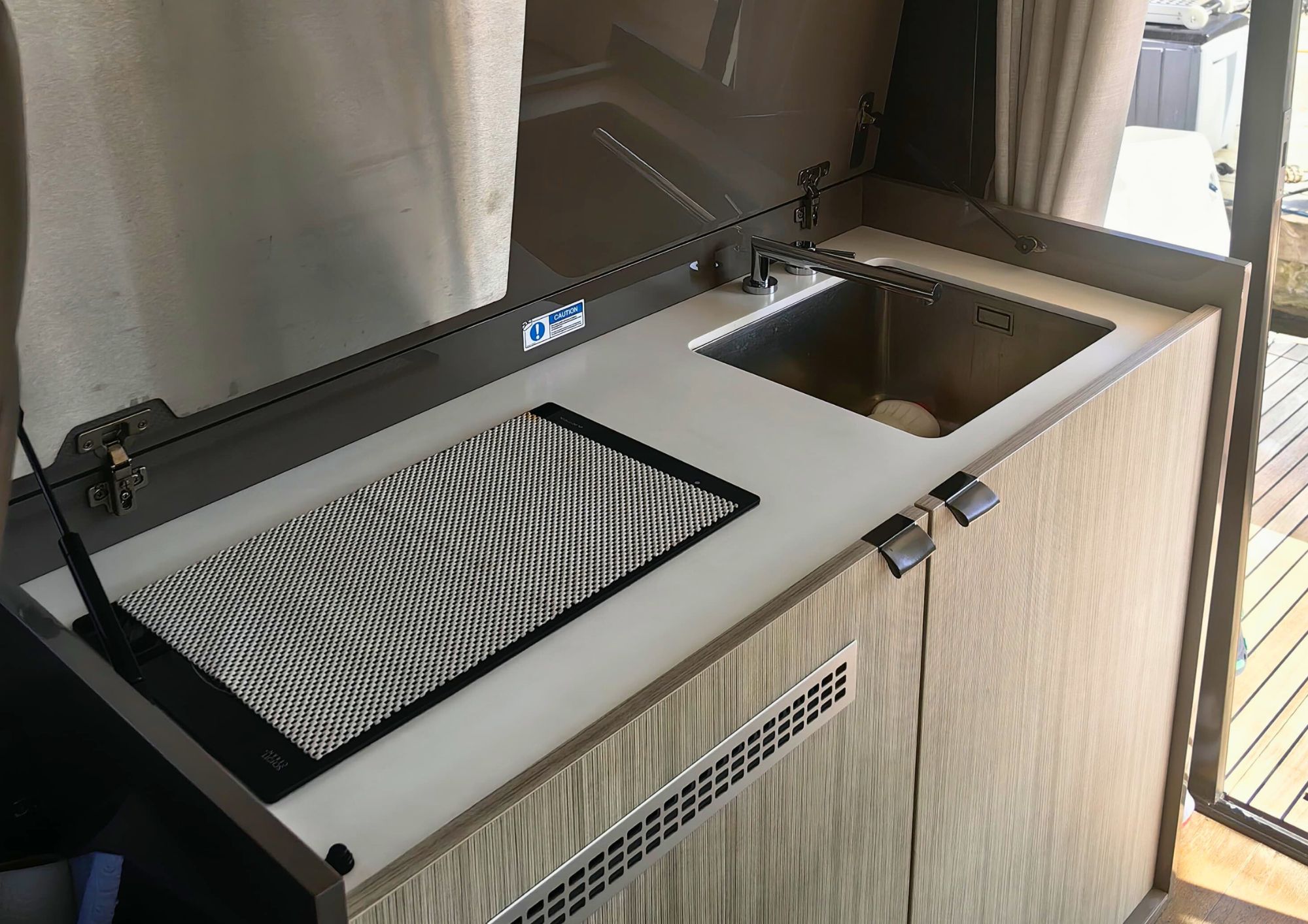 The interior features comfortable cabins, a salon, and a fully functional galley with refrigerator, freezer, cooker, and water heater. The deck is designed with practical details such as anchor systems, hydraulic installations, and durable windows and hatches.