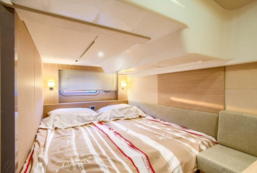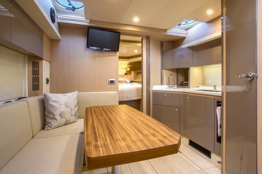 the owner's cabin in the bow and the guest cabin in the stern, with the centre housing the galley and dinette which can be transformed into a bed for two.