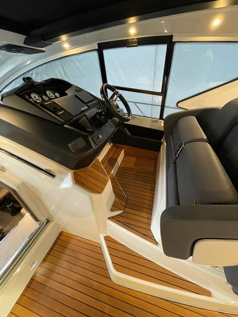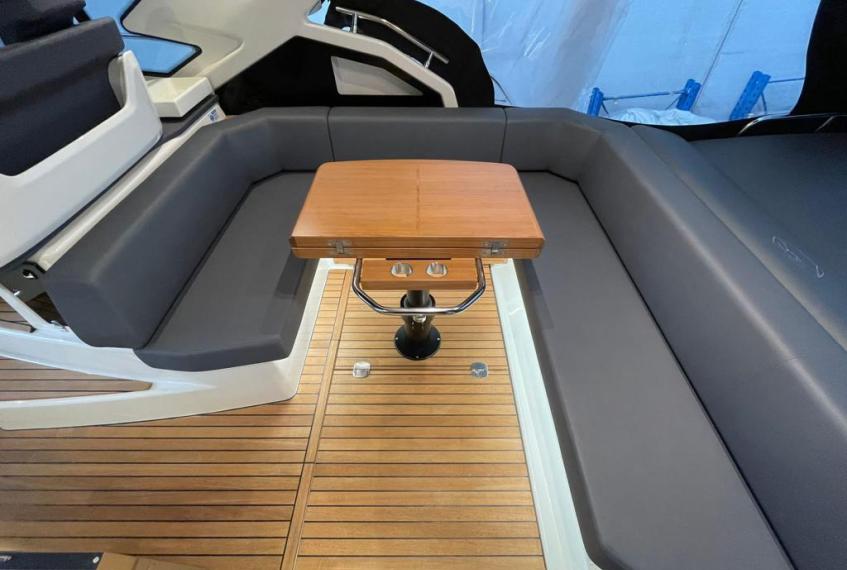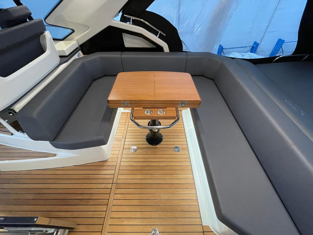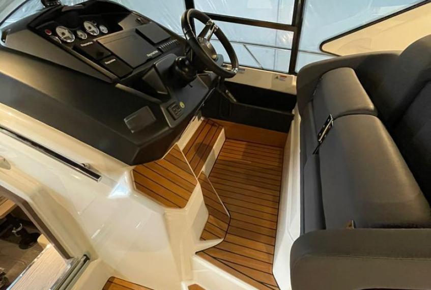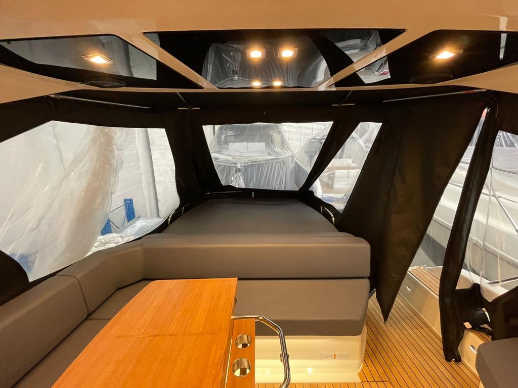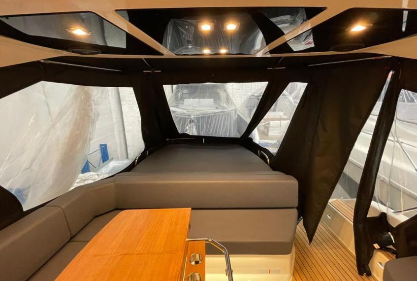 Generatore, Aria Condizionata cabina, Teak Plancetta, Teak Pozzetto e camminamenti prua, Passerella idraulica, Autopilota, Verniciatura metallizzata Hard Top “Grigio Mercurio”, Antenna DPS Volvo per ancora digitale, interni versione premium con mobilio in Rovere Brezza e pavimento con doghe ecc…