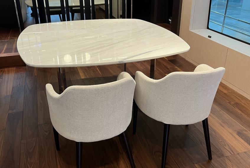 SALA PRANZO CON TAVOLO IN MARMO E SEDIE IN PELLE