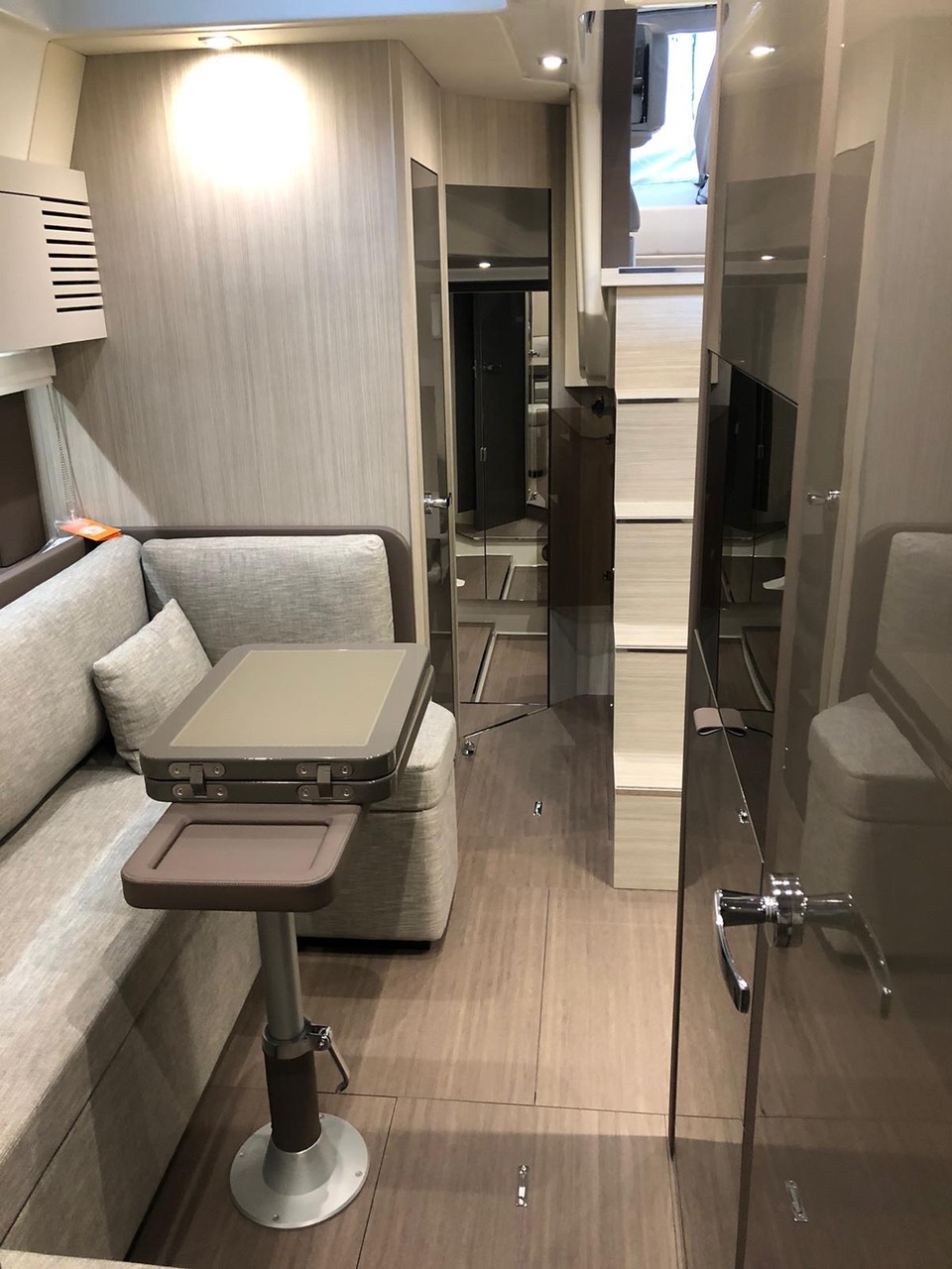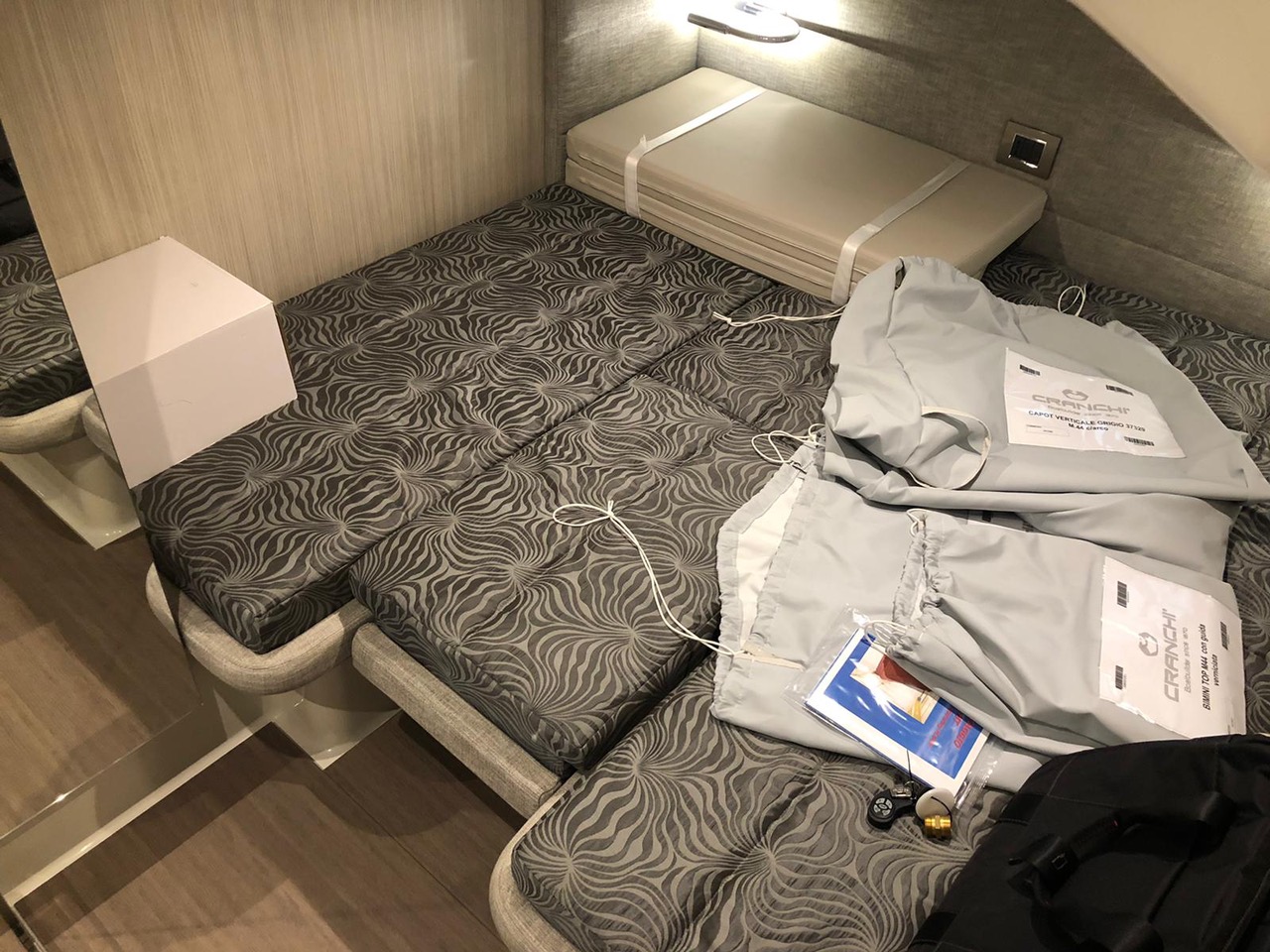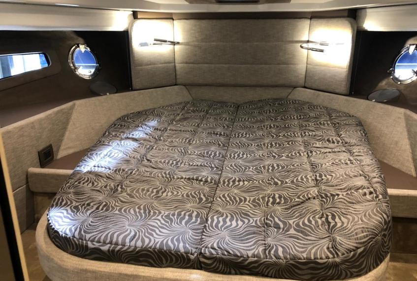 Waste water tank Ultramarine stainless steel anchor kg 21 Antifouling black colour, n.2 coats (no propellers) Air-conditioning system 16.000 BTU cabins,whith heat pump Air-conditioning system 8.000 BTU cockpit cooling, with heat pump Hood for complete stern closing Bow shower Bow thruster with automatic fire extinguisher Cockpit fridge G.P.S. + colour chartplotter 5 KW Generator Additional external courtesy lights N.6 fenders + fender covers Hydraulic gangway m 3, 3 steps Radio system upgrade: n.2 speakers on the foredeck, n.2 on the hardtop, subwoofer in the cockpit with dedicated amplifier Teak laid cockpit Solid teak coverings on lateral stringers 28" Saloon LED TV + DVD + cockpit predisposition + inverter V.H.F./DSC Copy of “CE” certificate and declaration of conformity Hood: alternative colour to standard one INTERIORS IN WOOD Breeze oak 10.69 Cabins' floor in oak staves Soft-Top canvas: alternative colour to standard one Soft Top lacquered (paint no gelcoat) (**)