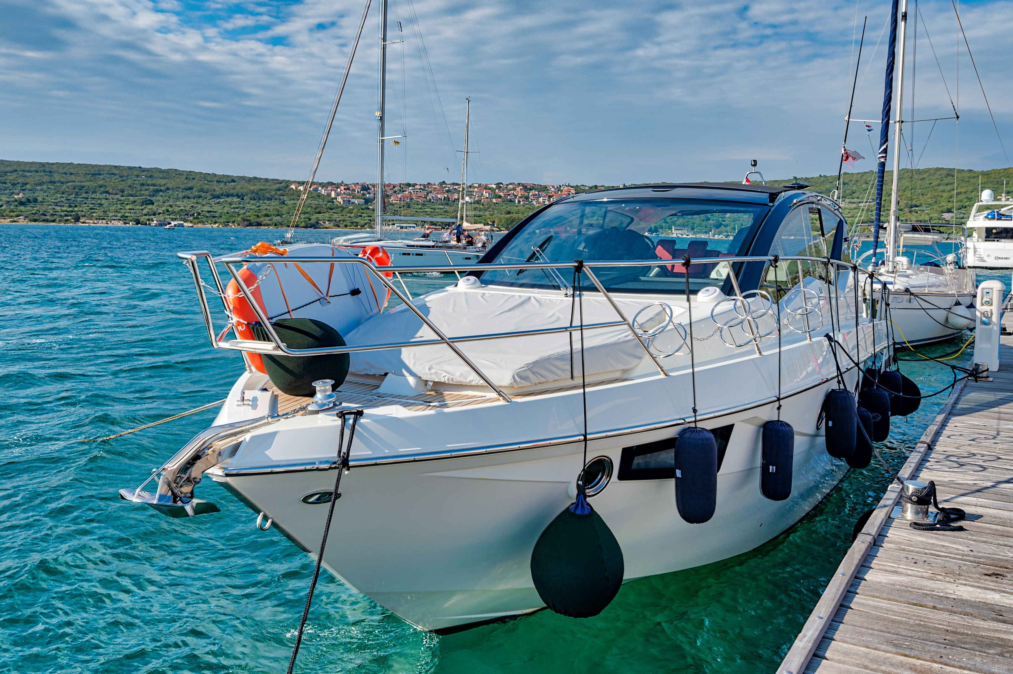 Anchor (21kg stainless steel), Automatic Bilge Pump, 3 Batteries, Battery charger (35ah), Bilge Alarm (Acoustic and visual on dashboard), Bow Thruster (Sidepower), cockpit table, Courtesy Lights, 2 Deck Shower (bow and stern), Directional Spotlight, Draining System, Electric Bilge Pump, Electric Flaps, Electric Windlass, Engine Alarm, Entry door, 4 Fire Extinguishing System, Flaps Indicators, Gangway (Besenzoni 3m), Horn, Living Room Foldable Table, Manual Bilge Pump, Platform (Hydraulic HI LO platform), Shorepower connector, swimming ladder, Teak Cockpit, Tender Garage, 3 Underwater lights, Water pressure pump