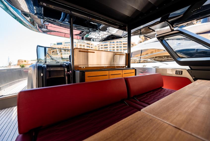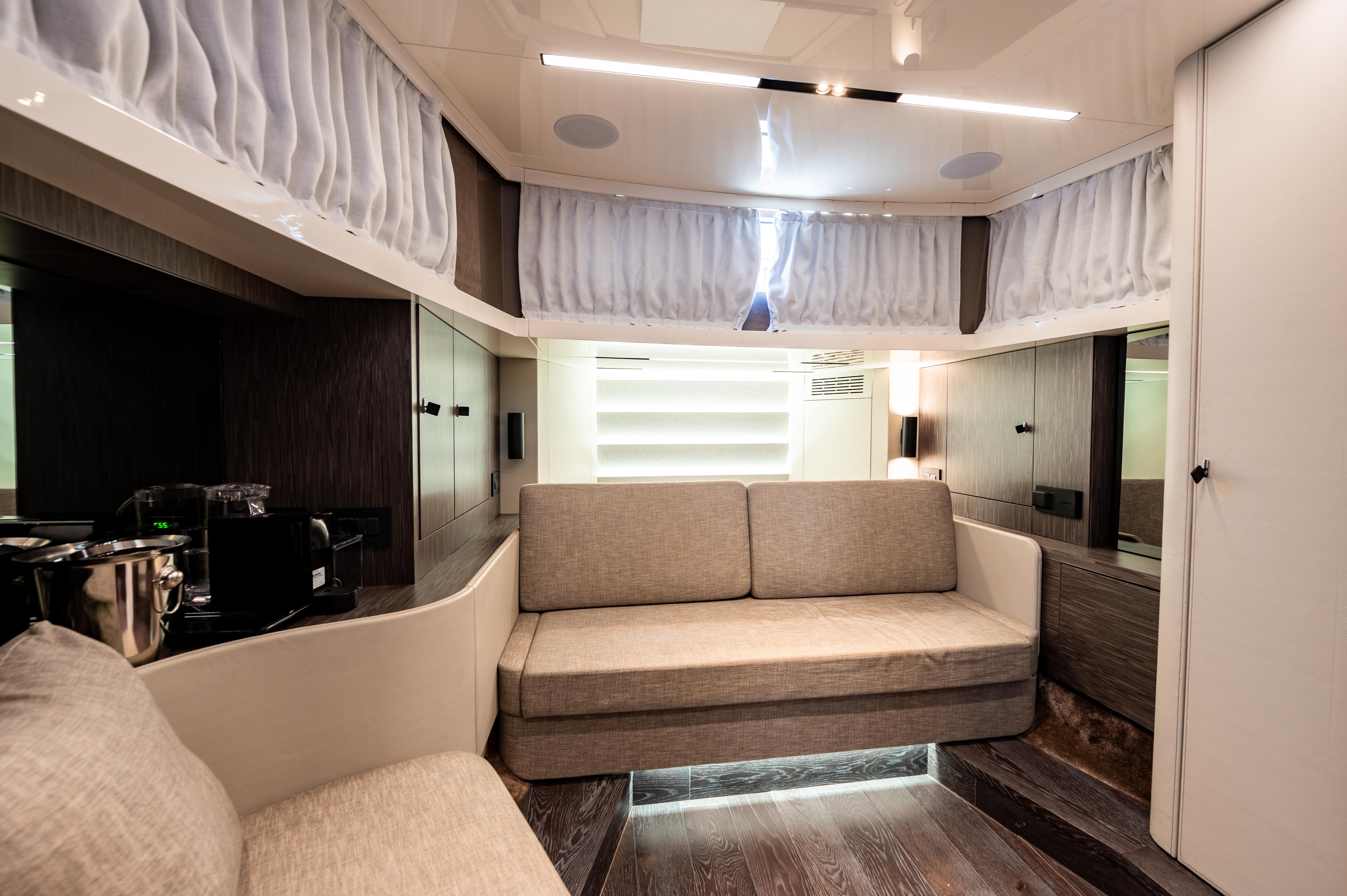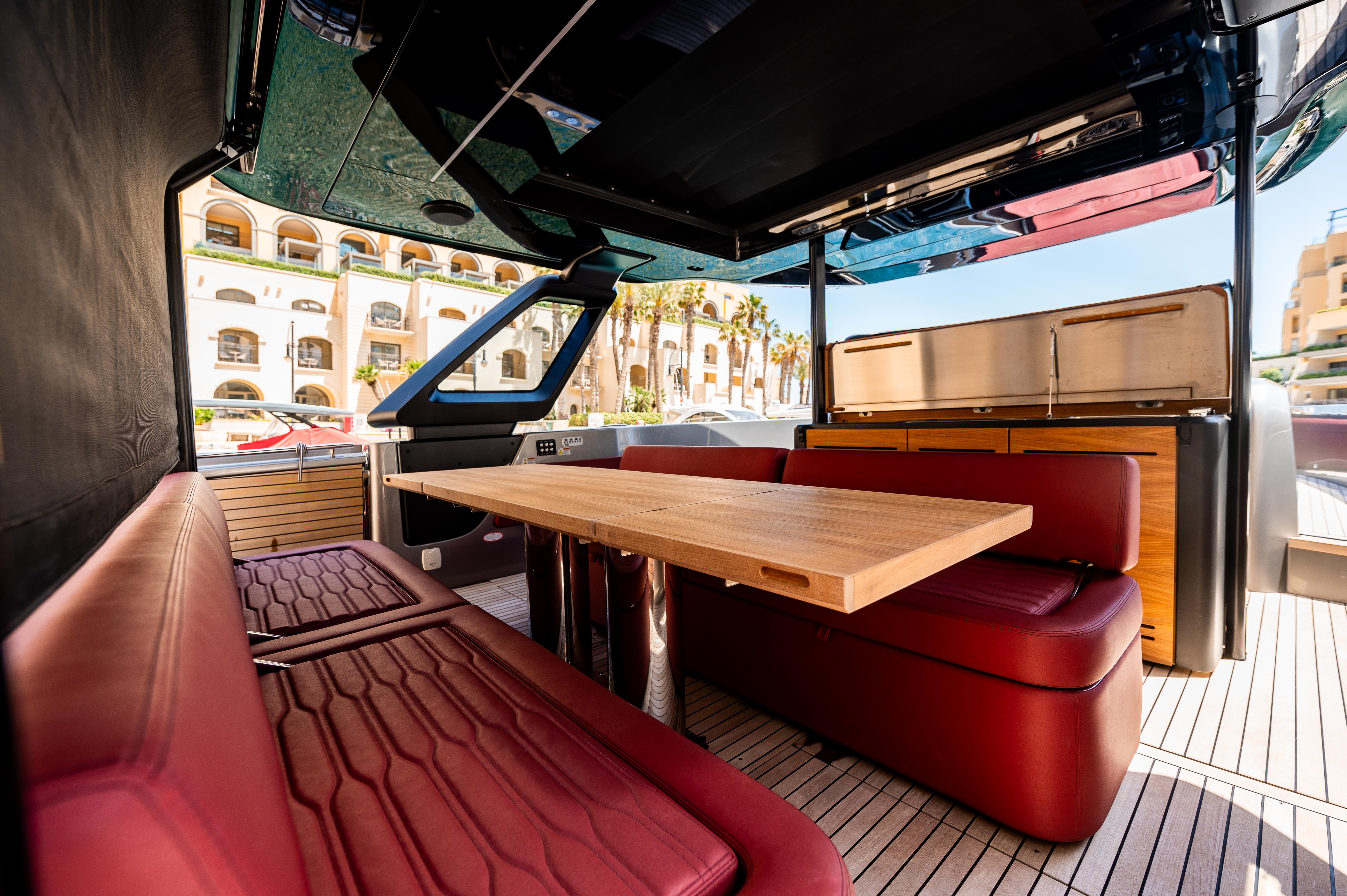 A thoughtfully designed layout to maximize comfort and usability, blending practicality with luxury. The cockpit serves as a central hub for socializing, featuring a well-equipped wet bar with a stove, sink, refrigerator, and ice maker. The dining area aft of the bar includes spacious seating, with a sofa facing the bar and a stern sundeck that converts into an additional sofa with its adjustable backrest. This versatile space provides the perfect setting for dining, sunbathing, or lounging.