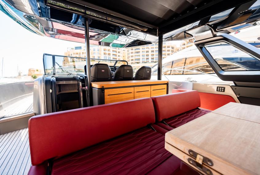 Below deck, the A46 provides elegant and functional accommodations. The dinette easily converts into a comfortable sleeping area, complementing the full-beam aft cabin, which features ample storage and refined finishes. A spacious bathroom with a separate shower cubicle ensures privacy and convenience. Throughout the boat, modern amenities such as wireless chargers, USB ports, and integrated entertainment systems enhance comfort and connectivity, making the A46 a truly luxurious and versatile vessel.