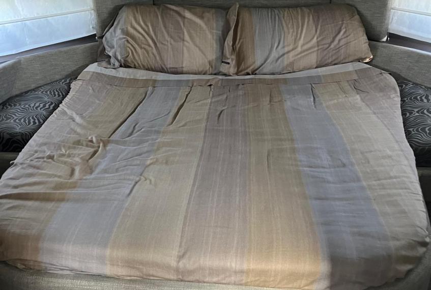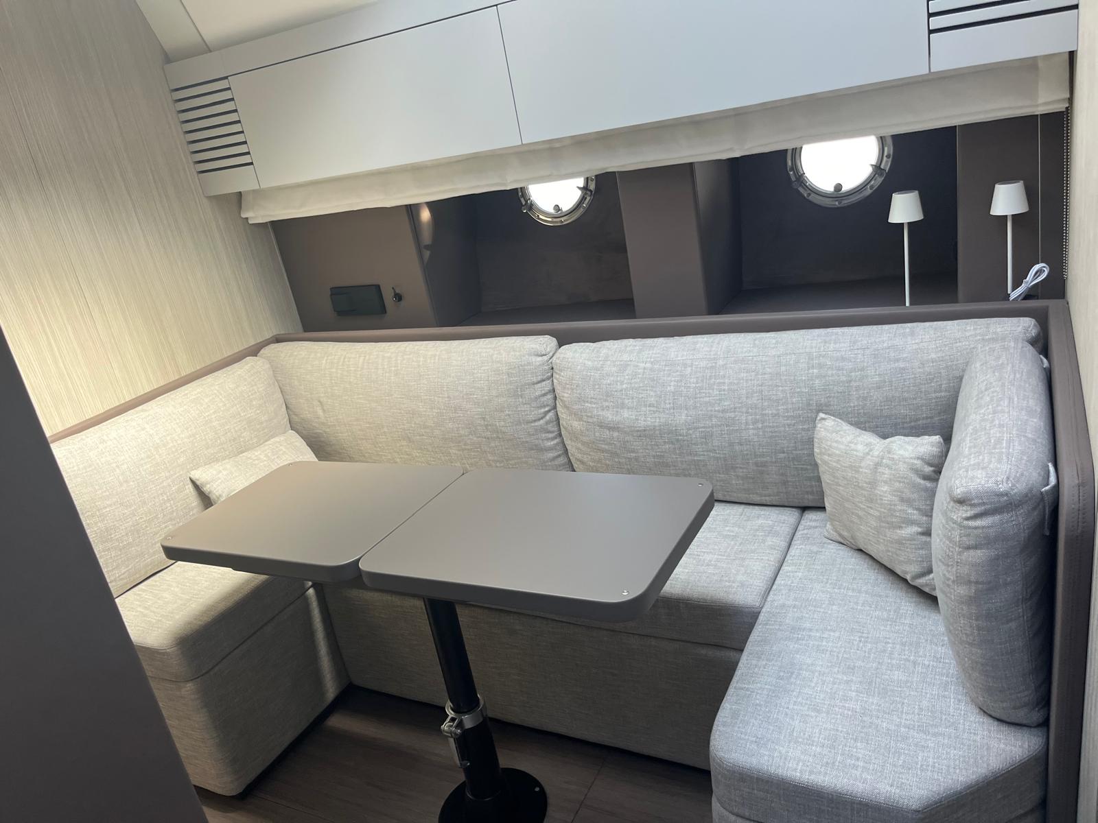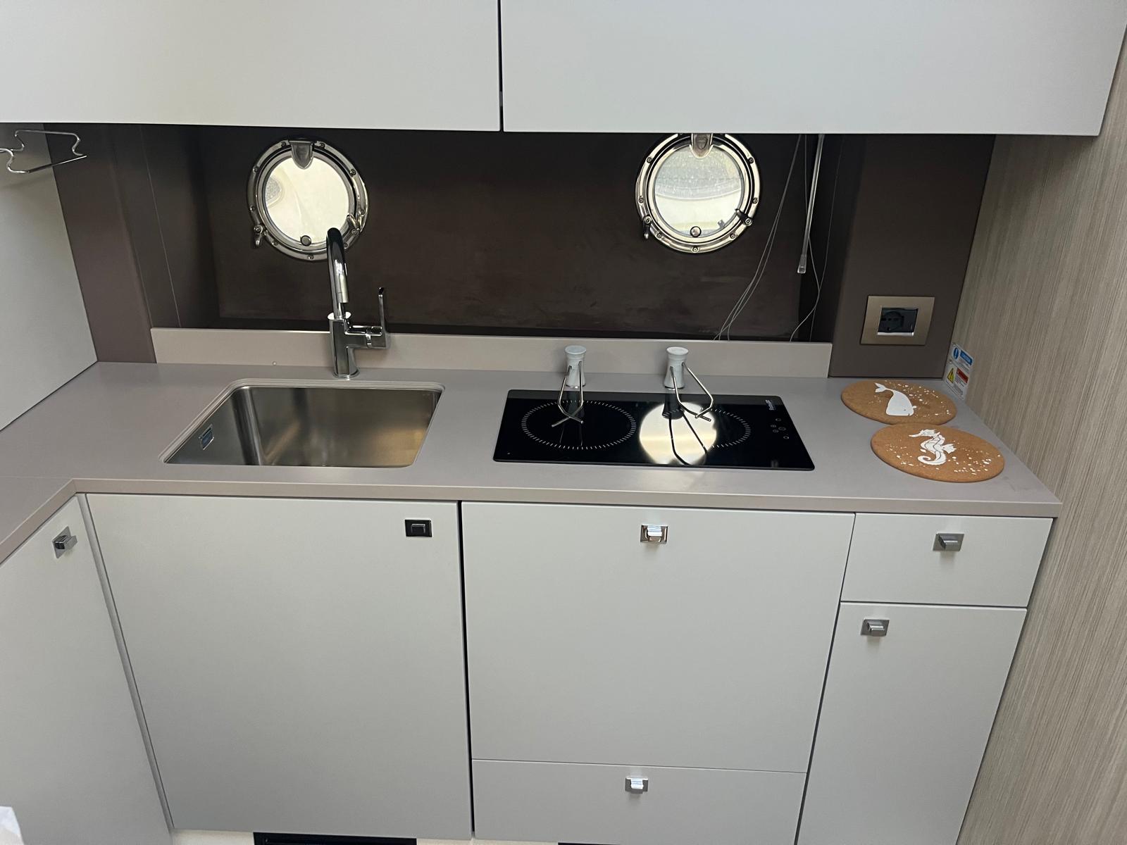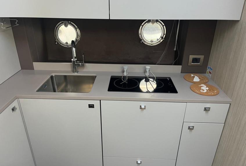 Cabina armatoriale a prua con bagno privato, cabina ospiti a poppa con 3 posti letto, bagno ospiti, dinette trasformabile, grande cucina.