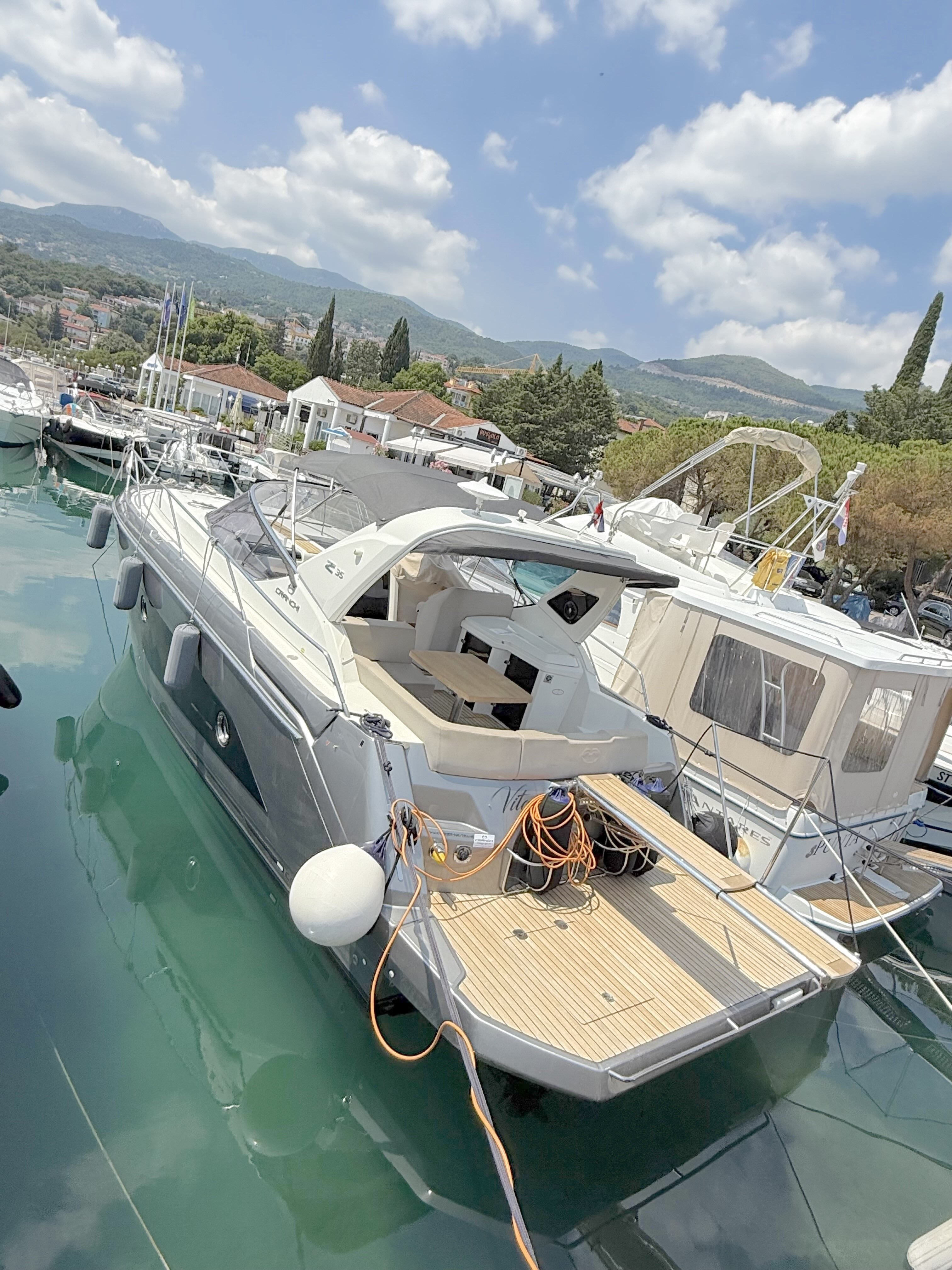 Bow and Stern Thruster + add. battery , Bilge micro suction system , Waste water tank , Ultramarine stainless steel anchor kg16, AC/DC 220V , Complete hood (with bimini),Cockpit fridge, Colour GPS/CHARTPLOTTER 10" ,Microwave oven, 3,5kw Generator , Electric cockpit grill, Air conditioning system 16.000 BTU with heat pump , Underwater lights n.3 , N.2 saloon roof window blinds , N°6 fenders + fender covers, Autopilot Garmin, Teak laid swimming platform , Teak laid cockpit , Cockpit cover , Salon Led TV + prearrangement in the cabins , V.H.F./DSC Garmin , Copy of “CE” certificate and declaration of conformity , Hood: alternative colour to standard one , Fernder covers: alternative colour to standard one , Exterior upholstery Silvertex: alternative colour to standard one , HULL lacquered (paint)
