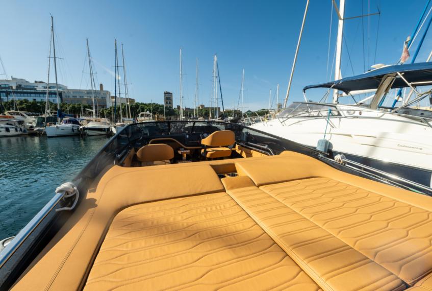 This model is particularly traditional, demonstrated by the teak clad bow deck, recalling the classic heritage of wooden boats which acts as a visual counterpoint to the teak-clad stern platform. And of course, innovative and functional solutions are not lacking.