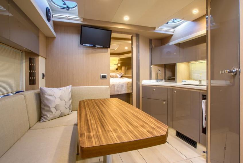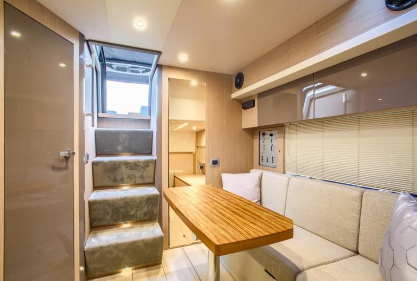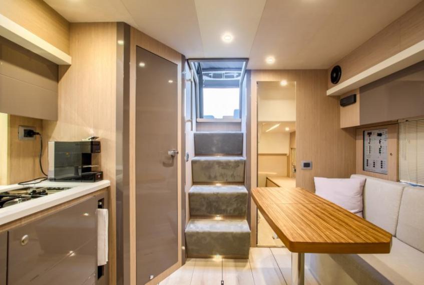 the owner's cabin in the bow and the guest cabin in the stern, with the centre housing the galley and dinette which can be transformed into a bed for two.