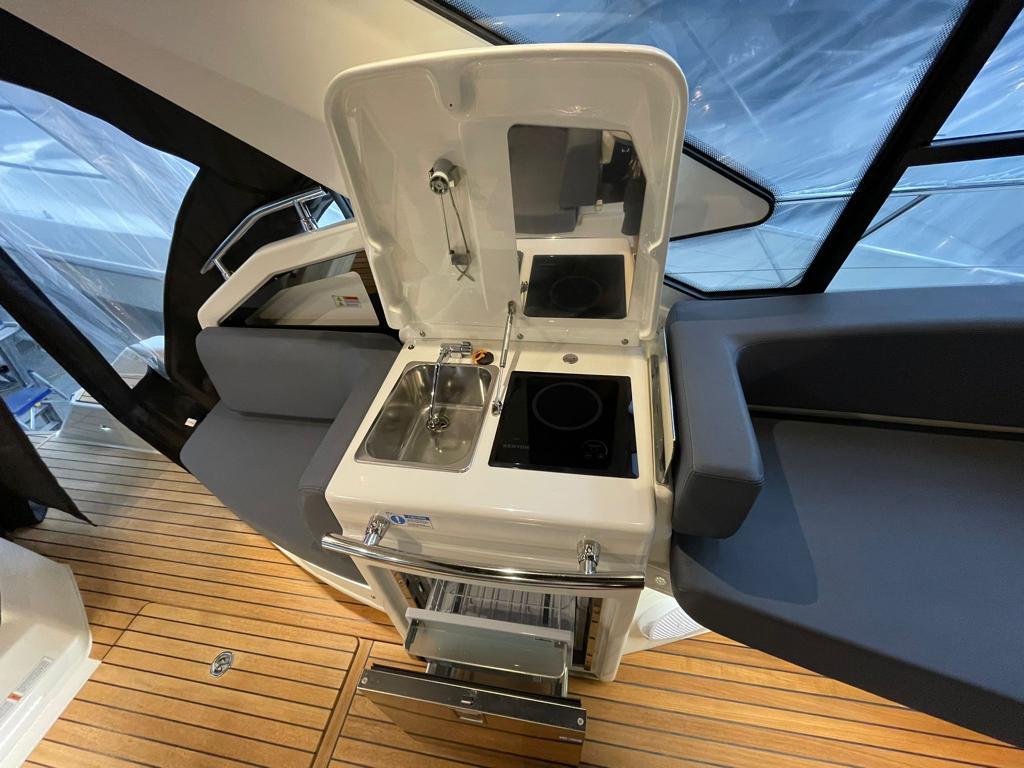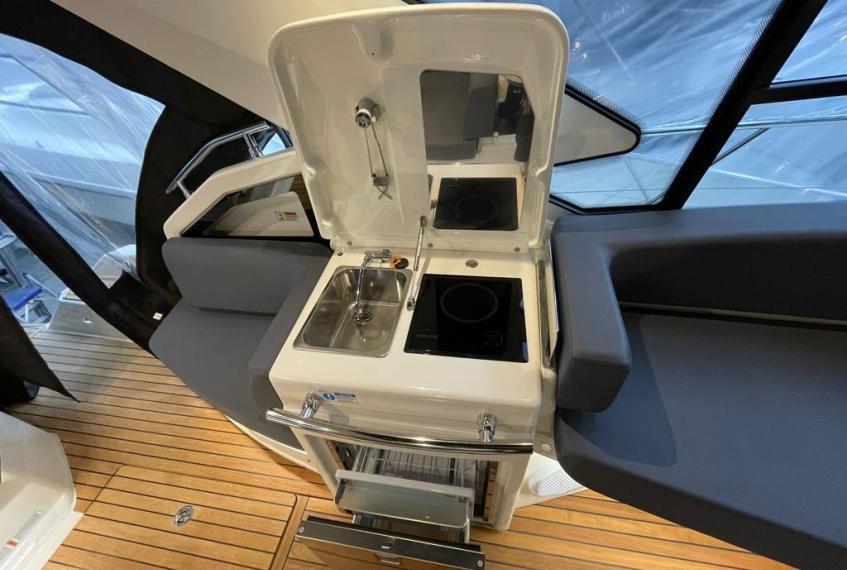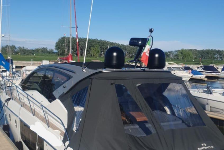 Generatore, Aria Condizionata cabina, Teak Plancetta, Teak Pozzetto e camminamenti prua, Passerella idraulica, Autopilota, Verniciatura metallizzata Hard Top “Grigio Mercurio”, Antenna DPS Volvo per ancora digitale, interni versione premium con mobilio in Rovere Brezza e pavimento con doghe ecc…